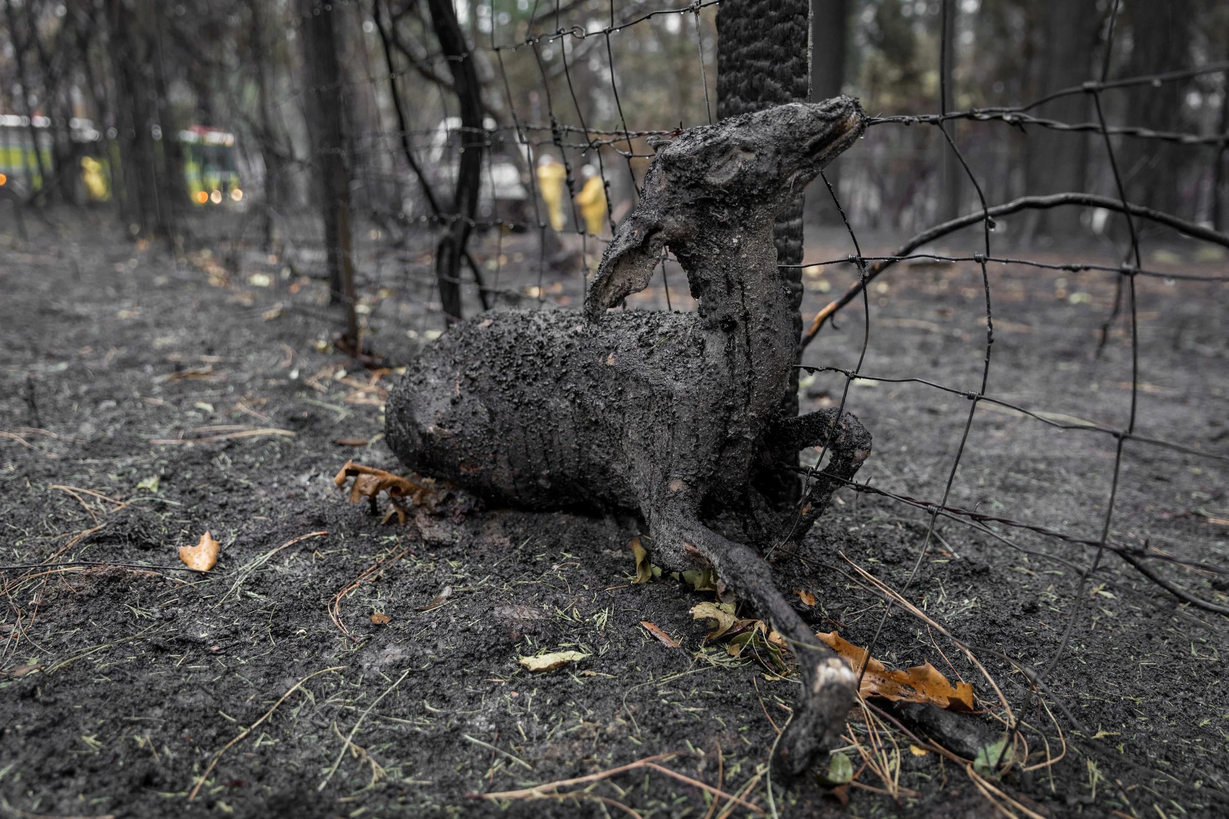 An animal stuck in the barbed wire burned after being unable to escape the Camp Fire — Concow, CA — November 21st, 2018